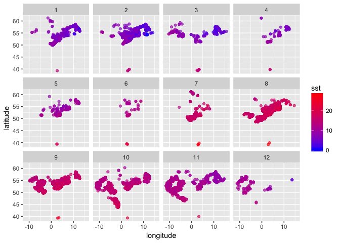 You can now plot sole occurrences by lon and lat, colour coded by temperature, faceted by month (1 = Jan to 12 = Dec) - this first requires defining a month variable: