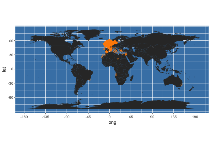 (occ_map <- worldmap + geom_point(data = my_occs, aes(x = decimalLongitude, y = decimalLatitude),