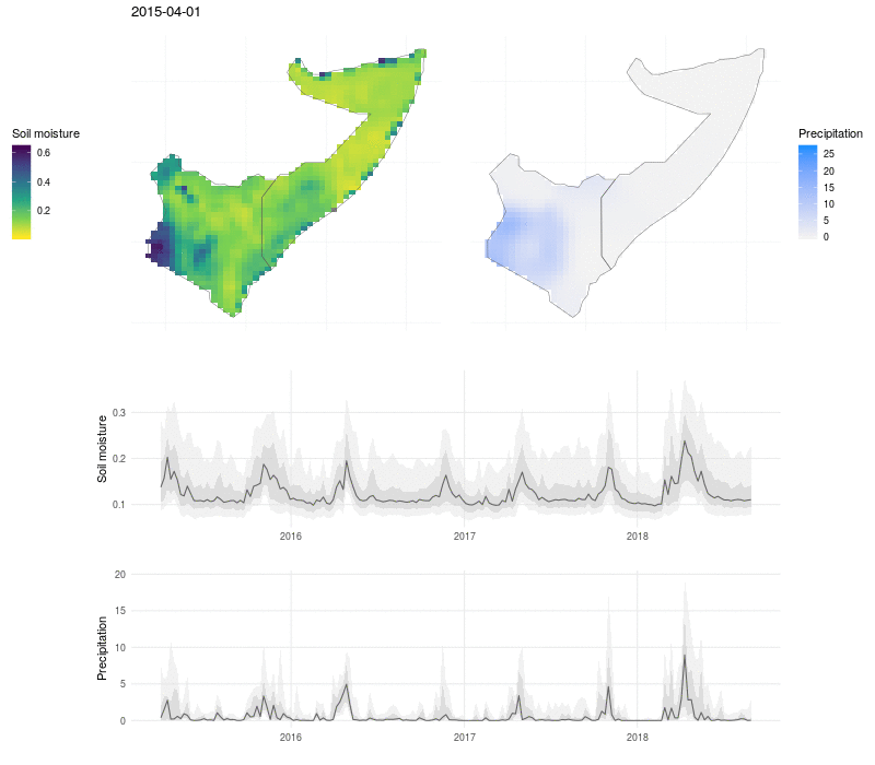 Here the soil moisture and precipitation values are mapped over time, with line plots below to show the median value (black line), interquartile range (dark grey ribbon), 10% and 90% quantiles (light grey ribbon). The exceptional nature of the flooding in 2018 shows up as a high and broad peak in soil moisture and precipitation, and the drought that preceded the flooding in 2017 is visible as a period of low rains and dry soil.