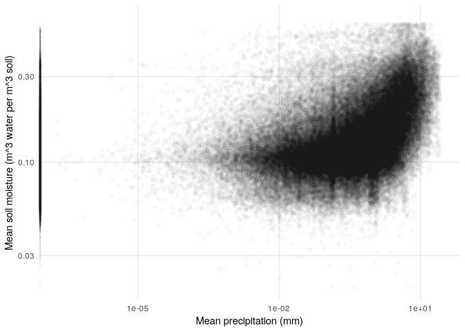 Notice the band of zero-precipitation points that sit on the y-axis. Among nonzero precipitation values, it seems like there is a nonlinear relationship between precipitation and soil moisture.