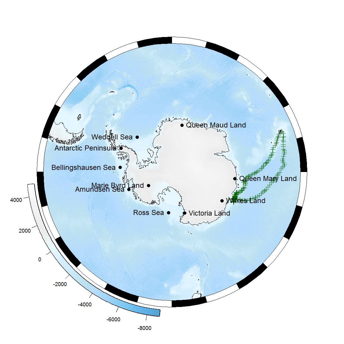 SCAR maintains a gazetteer of place names in the Antarctic and surrounding Southern Ocean2, which is available to R users via the antanym