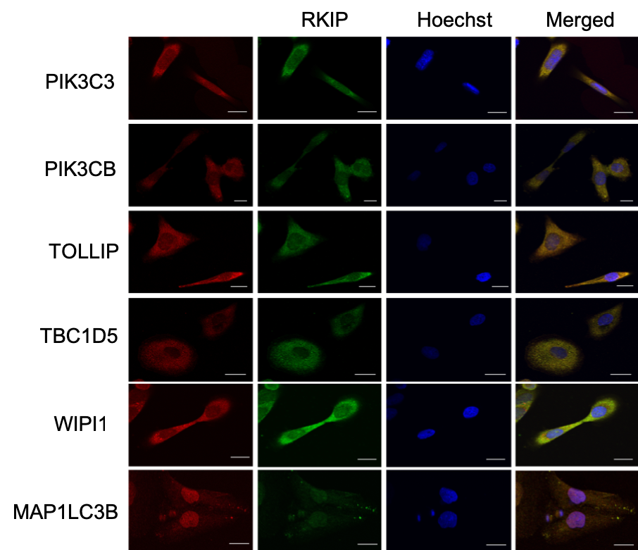 The graph shows the co-localization statistics (PCC) for RKIP and six other proteins (x-axis). The pixel intensity of the channel of each protein (red) and RKIP (green) in three regions of interest from multiple images were used to calculate the PCC. In all cases, the correlations were above 0.75 with reasonable variance. This means a high degree of co-localization between RKIP and the six target proteins.