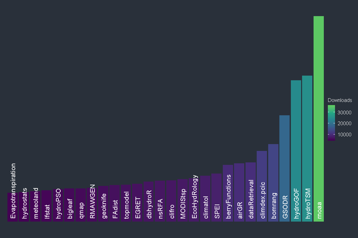 It is illustrative that the top four packages feature two modelling packages and two data packages. These are the basic tenets of hydrological research and indicate how those in the hydrological space are using R.