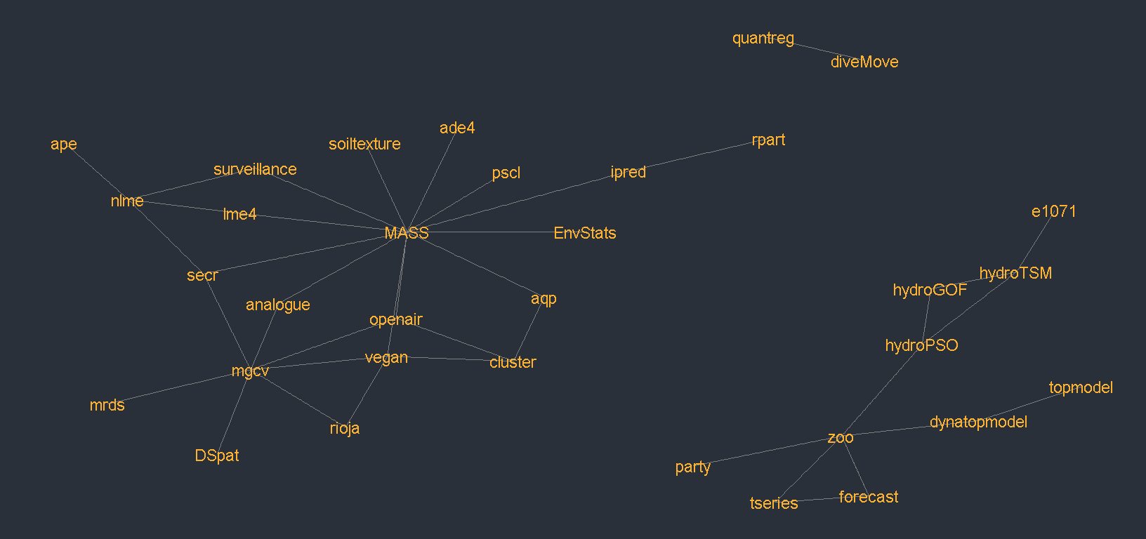 While there are clearly fewer connections than in the tidyverse package ecosystem, there is still quite a large amount of connectivity in Environmetrics task view In particular the mgcv