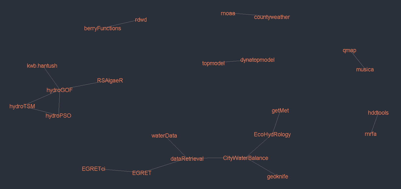 Clearly some connectivity among water-related packages is already happening, which serves as a reminder that CRAN task views aren’t the only place people discover packages to use. Some tools form a hub of connected packages because they share a common package maintainer (see hydroGOF
