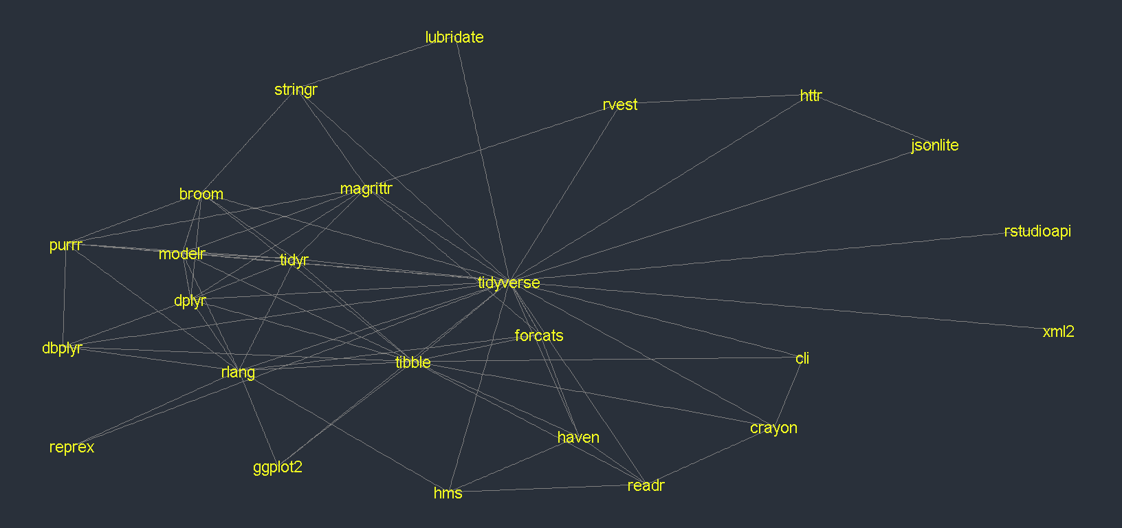 As you might expect, we see many intersecting lines traversing in all directions; many packages in the tidyverse import other packages in the tidyverse. This is expected as tidyverse development is coordinated.
