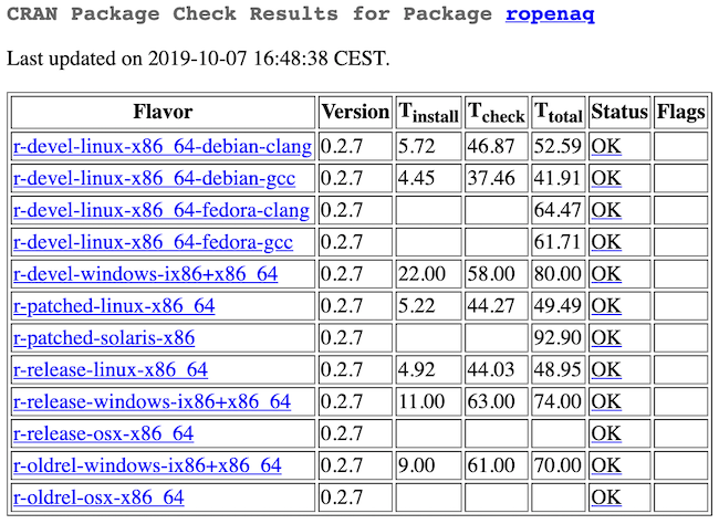 If you have an R package on CRAN, you probably know about CRAN checks. Each package on CRAN, that is not archived on CRAN1, has a checks page, like this one for ropenaq