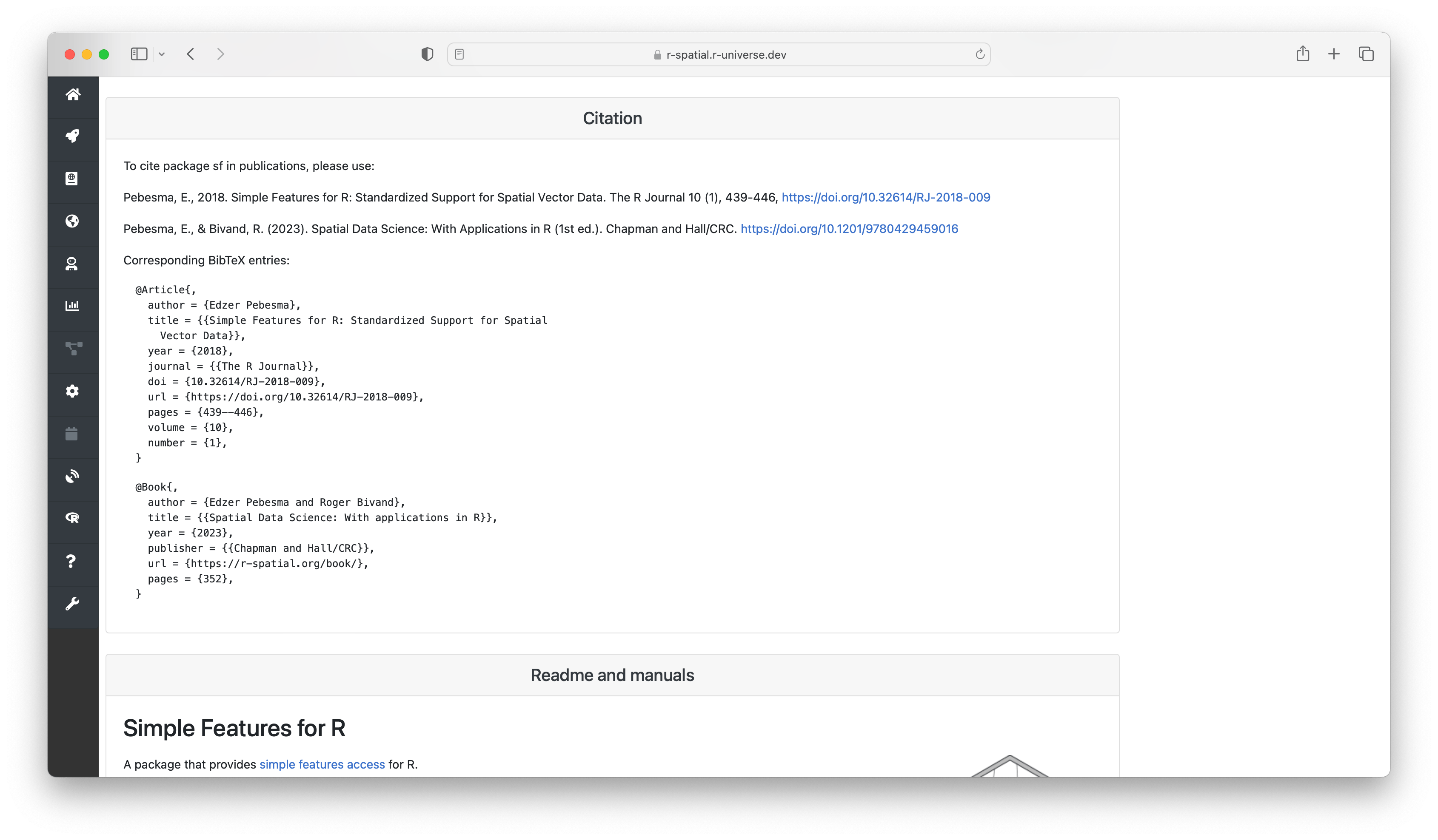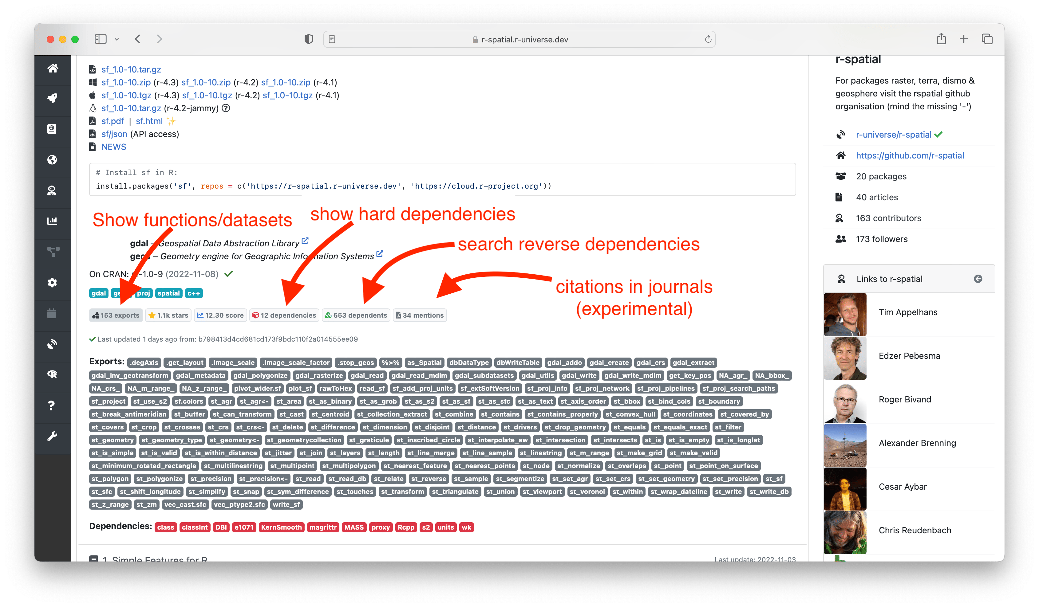 Here you can also find more information derived by the build system, such as which system libraries the package builds on, topics, and if the package is on CRAN. The badges underneath show statistics about the package, such as dependencies, reverse dependencies, and GitHub stars. Clicking on the ’exports’ badge will show all functions and datasets exported by the package, which link to the respective sections in the manual page. If specified, we also show how the package should be cited in papers.