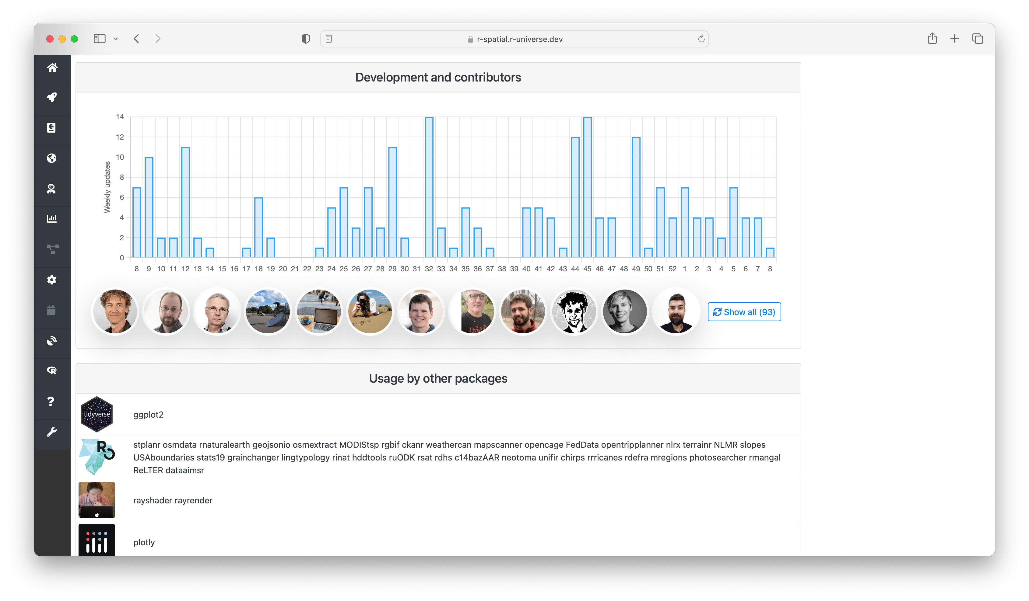The “development and contributors” section shows a bar chart with the number of commits per week for the last year, and who the main contributors are. Finally the section “usage by other packages” shows other packages on r-universe depending on this package, grouped by owner. This gives you some indication on how active the project is, and who are involved.