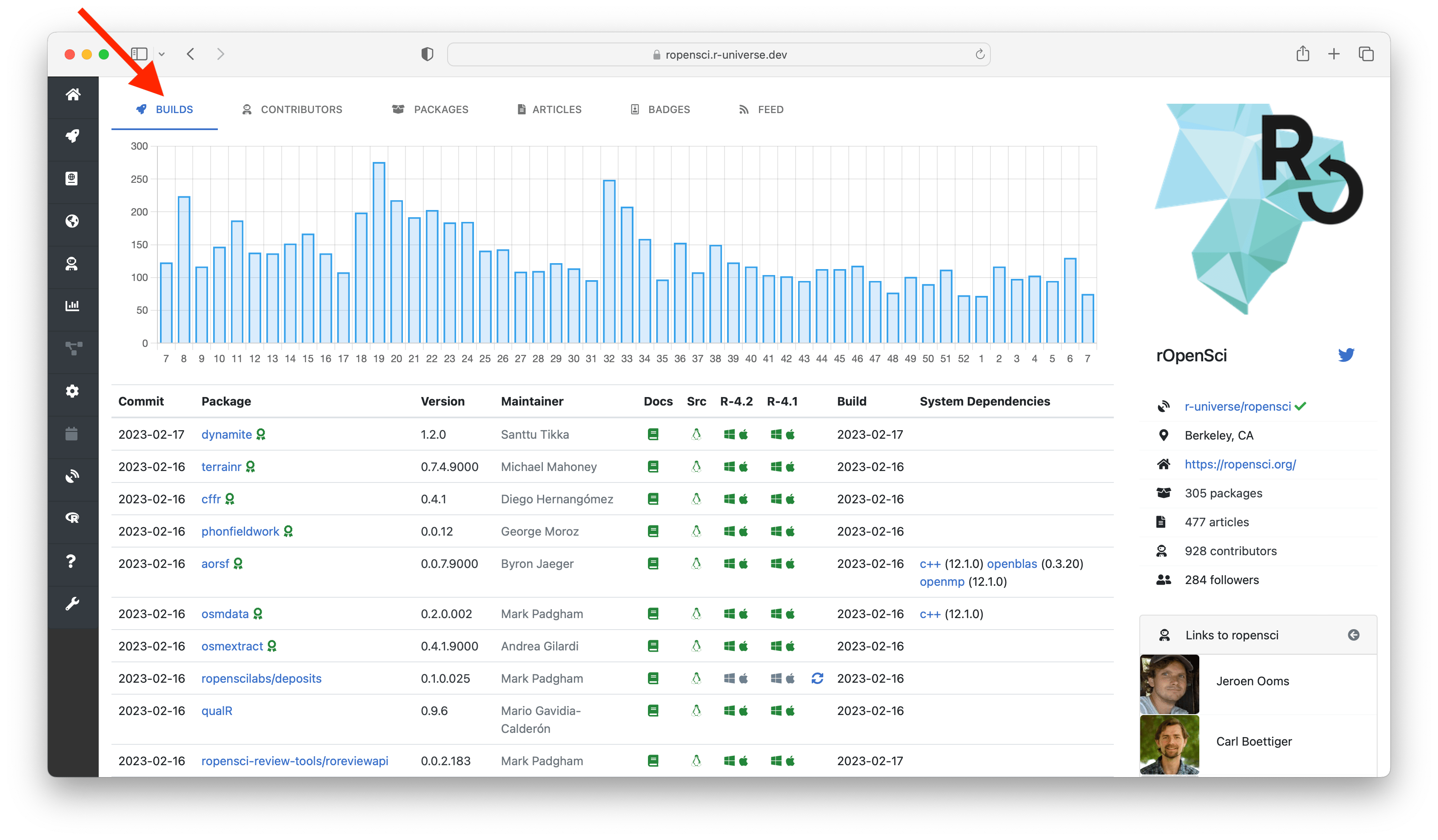 The top tabs allow you to explore different resources within universe. The builds tab shows the current state of the repository: a table with the name and version of each package, including the commit date, author, and build status. Clicking on the package name in the table sends you to the homepage of the package (more on this below), and the maintainer name links to the subdomain of that maintainer, listing other projects maintained by this person.