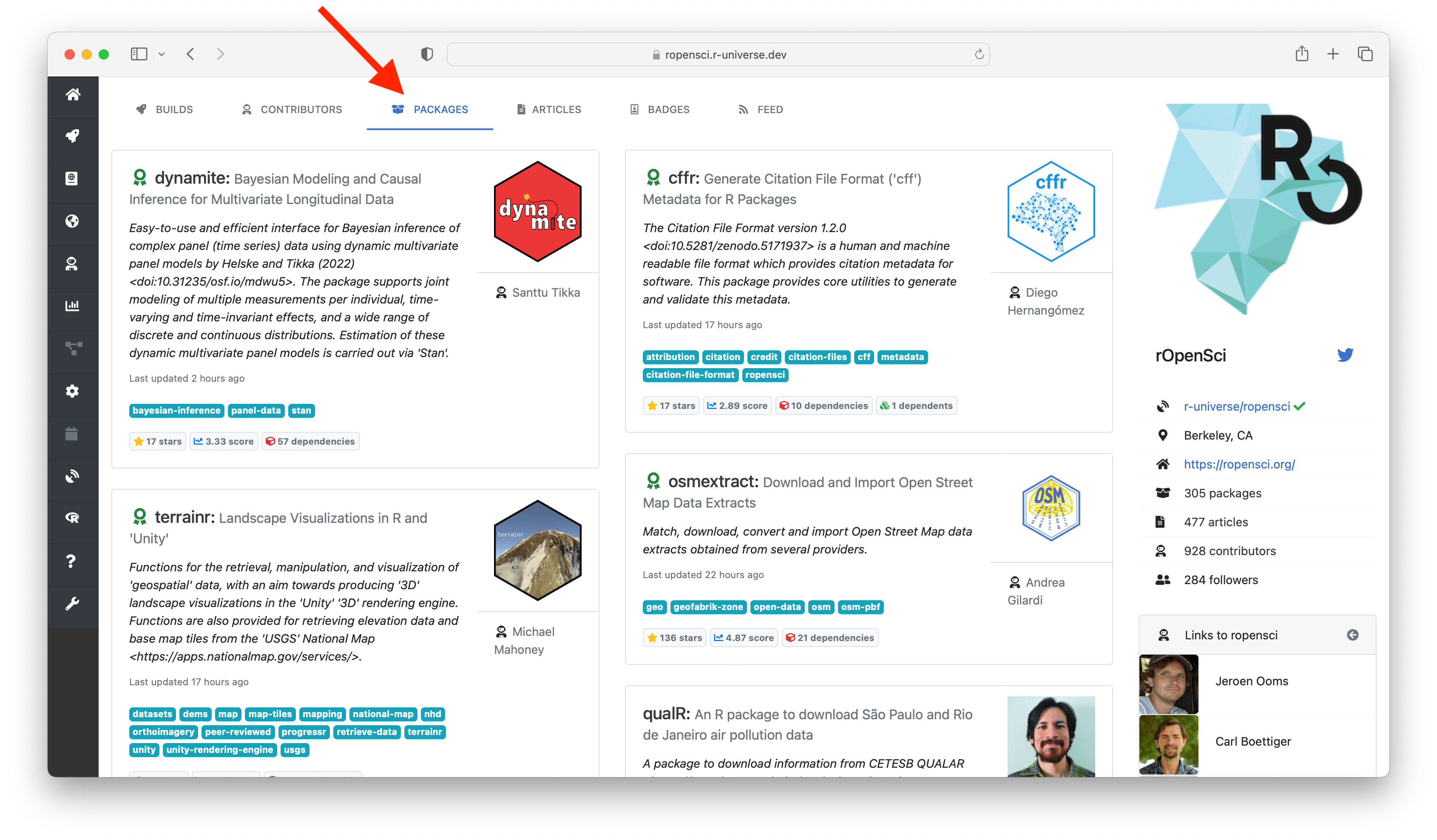 Once you become more familiar with the ecosystem, you may get interested to zoom in to a specific suite of packages from a given group or researcher. The r-universe domain structure lets you browse packages and articles by organization, and discover related work with similar maintainers, contributors, or users.