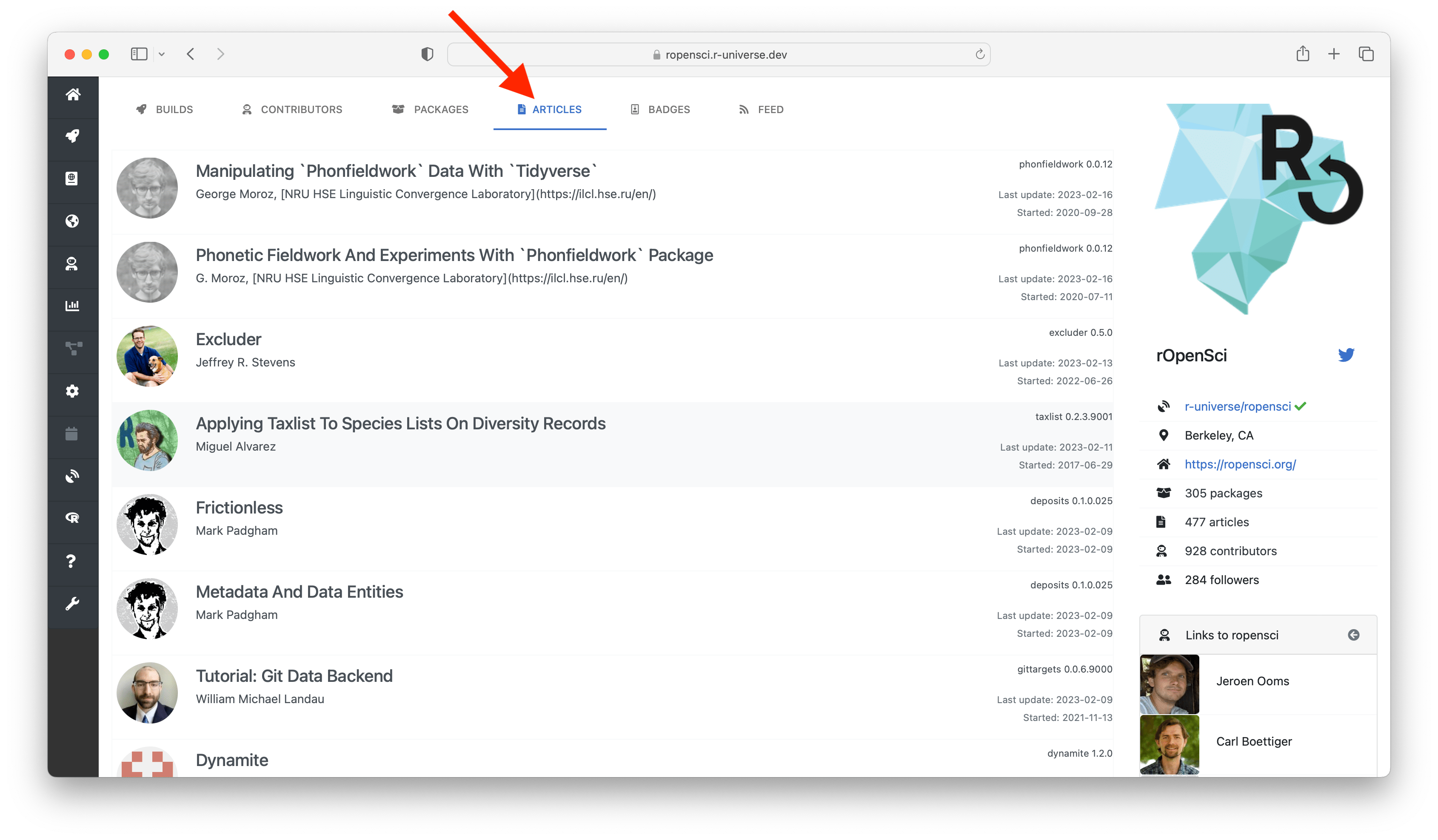 The packages tab lists descriptive information from all packages in the repository, and the articles tab shows all documents (e.g. vignettes). The contributors tab shows a chart with contributor statistics for the organization or maintainer. Clicking on the a bar in the chart sends you to this other universe where you can explore more work by this person.
